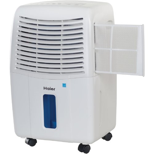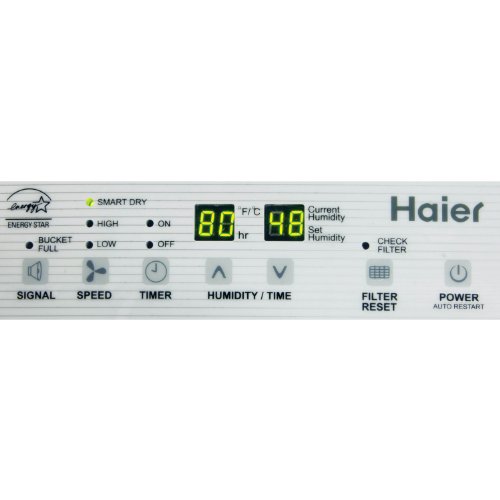 Haier's 65-pint dehumidifier is a good choice for wet conditions removing 65 pints of damaging moisture from the air per day. Features include electronic controls with digital display, two speeds plus Smart Dry and a 24-hour timer. Smart Dry adjusts the fan speed automatically according to the current room conditions and the preferred settings. This unit has a bucket-full indicator light with an audible alarm plus a large, front bucket with a handle to make emptying the unit quick and easy. The unit automatically stops once the bucket is full. Plus, it has a drain on the back of the unit so you can attached a standard garden hose to continuously drain the unit into a floor drain (hose not included).2-speed dehumidifier with Smart Dry