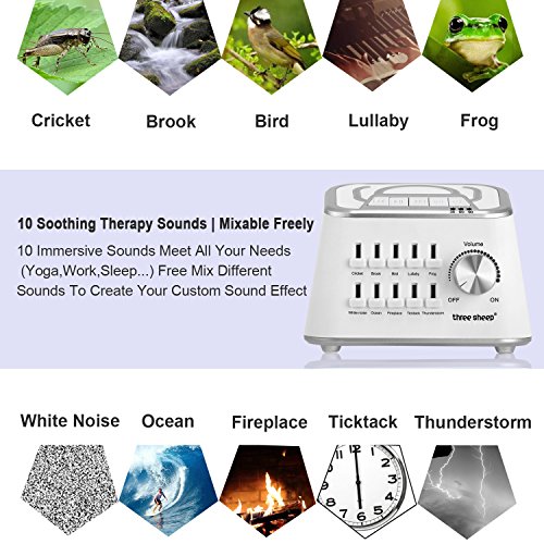 【Over 1,000 Combinations of Sounds】- 10 natural sounds, cricket, brook, bird, lullaby, frog, white noise, ocean, fireplace, ticktack, thunderstorm; Choose a single sound or multi-sound mixed to mimic the natural environment to provide the closest to the real environment experience