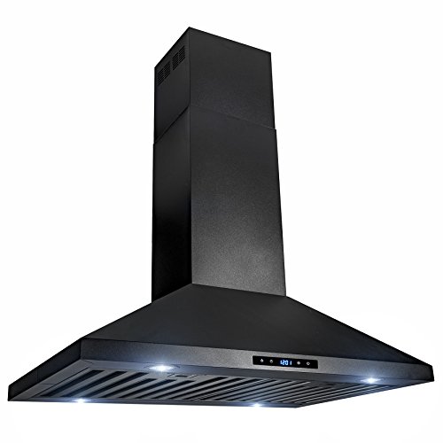 This AKDY 30-inch convertible island mount range hood gives your kitchen a modern elegant feel with its stainless-steel construction and black finish. The front touch panel gives you control of the 470 CFM four-speed fans, four lights, and a 12-hour clock for added versatility. Below the range hood comes with two black stainless-steel baffle filters to keep oil particles by trapping them and keeping your kitchen fresh. This range hood comes with a 198W motor and 1.77 airflow efficiency. For ductless recirculating installation, a carbon filter kit is available (sold separately: CF0002).