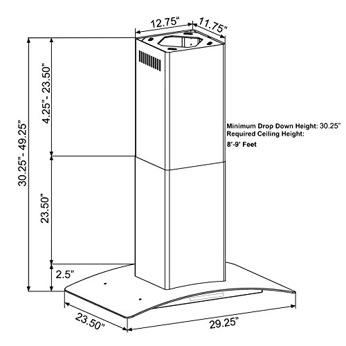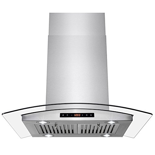 This AKDY RH0305 30 inch island range hood is popular for its sleek, slim, and stunning design. The innovative panel houses a dual-side sliding touch control, and features an 343 CFM blower and 3-speed fan, operated with intuitive digital controls. Four 1.5-watt LED light bulbs are pre-installed, offering elegant illumination for your cook-top. Two stainless steel baffle filters has a wide filtration area for quick clearing of smoke and fumes. Though designed for ducted use, it may be converted to a ductless (recirculating) range hood when you order an optional charcoal filter set. The ultra quiet fan keeps noise levels under 65db, so the brushed stainless steel adjustable chimney and tempered glass can add beauty and function to your kitchen without any disruption.