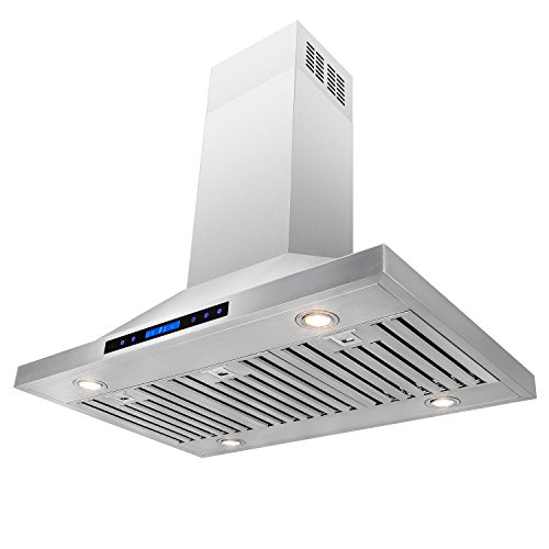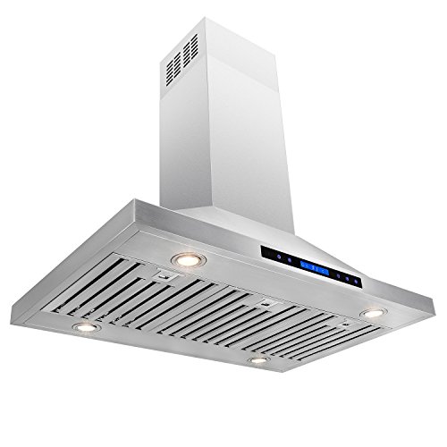 Absolutely perfect for modern kitchens, the AKDY® B02-IS-90 36" island mount range hood is constructed with practicality in mind. This range hood is powered by a quiet 343 CFM motor. A trio of dishwasher safe baffle filters pull unwanted grease from the air, as a 4 speed fan allows you to control how strong and quiet you need it to be. Four individual halogen light sources illuminate the cooktop. Constructed with dual touch screen interfaces, this range hood is perfect for kitchen islands. Included is a remote control for hands free use, as well as a timer for delayed shut off. Furthermore, this range hood is covered by a three year parts warranty. The convertible system can be used ventless/ductless with a carbon filter for home with no available venting option. (Carbon filters sold separately)
