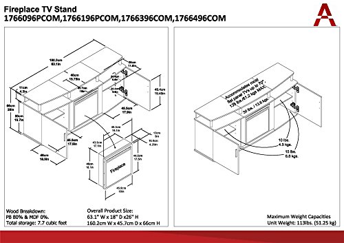 Create a cozy space in your home with the Ameriwood Home Carson Electric Fireplace TV Console. The black finish gives this TV Console a modern aesthetic sure to complement any room’s décor. The Stand is constructed of laminated particleboard with metal accents. The 18” firebox insert allows you to enjoy the ambiance of the flame with or without heat, and it features a LED light source boasting up to 50,000 hours of life. The Carson Electric Fireplace TV Console warms rooms up to 400 sq. ft. and also provides added storage with 2 large cabinets and open shelving to organize your gaming consoles, TV receivers, books, magazines and remotes. The Fireplace TV Console ships flat to your door and requires assembly upon opening. Two adults are recommended for assembly. The Console’s top holds up to a 70” flat paneled TV with a maximum weight of 135 lbs. Once assembled it measures out to be 26”H x 63.1”W x 18”D.Spruce up your living room with the Ameriwood Home Carson Electric Fireplace TV Console for TVs up to 70" with a maximum weight of 135 lbs