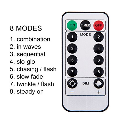 -Remote controller for 8 lighting modes: Combination (flash from mode 2 to 7 at random), In Waves, Sequential, Slo-gol, Chasing/Flash, Slow Fade, Twinkle/Flash, Steady On.