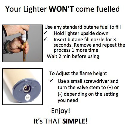 √ REFILLABLE - With butane fuel and use endless times. DOES NOT come with fuel. Have your butane pump handy or buy additionally for endless lighter fun.