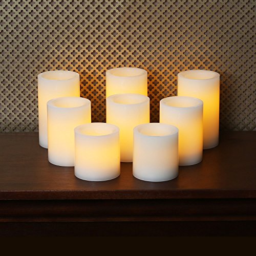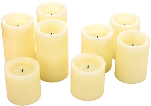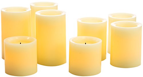 Set of 8 includes three 5"H, three 4"H and two 3"H smooth finish real wax flameless LED pillar candles. Each candle is 2-7/8" in diameter with a light vanilla scent. With the optional timer feature, the candles can be set to come on the same time each day and will provide up to 1,000 hours of glow time with 2 AA batteries (not included).