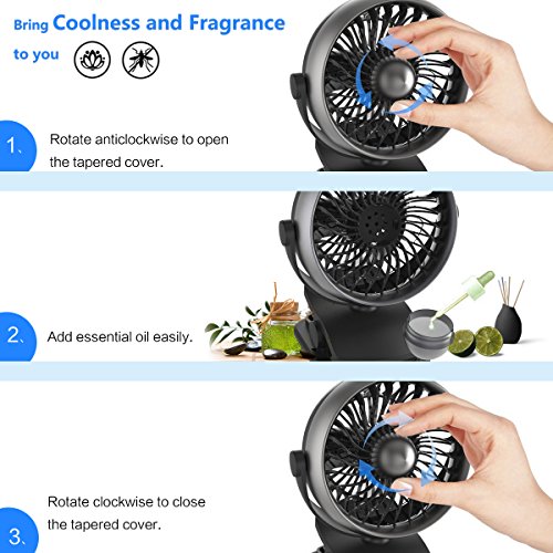 5.if you want to enjoy cool air then apply little essential balm or any peppermint essential on foam pad in Receptacle Behind shroud.2018 Upgraded Clip On Mini Desk Fan, have optimized the fluid mechanics structure to make enhanced airflow but operate quieter. Its appearance design imitates the jet engine, looks fairly exquisite and fashionable. And this fan also comes with the function of the fragrance storage --- You can remove the tapered cover and add repellent liquid into the white sponge to avoid bug bites and the fresh breeze will make you feel more relaxed and comfortable in summer.