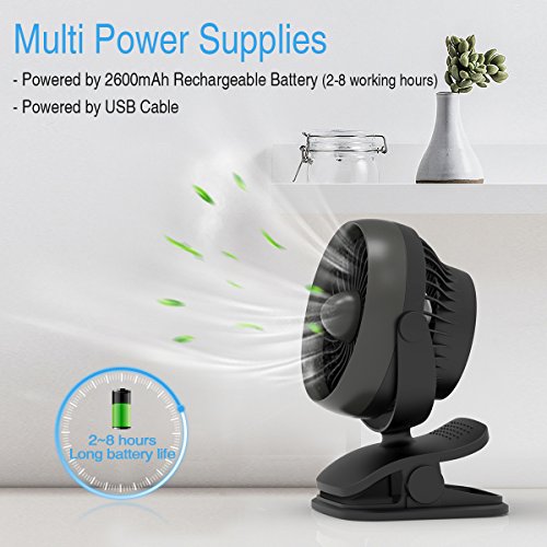 USB or 2600mAh Rechargeable Battery Powered. The mini clip fan can run off of its high quality replaceable and rechargeable 18650 battery (included) for 2.5-6 hours ---depend on different speed, or can also work and charge at the same time by laptop, power bank or USB charger via the supplied micro USB cord, which saves your money and hassle of buying batteries.