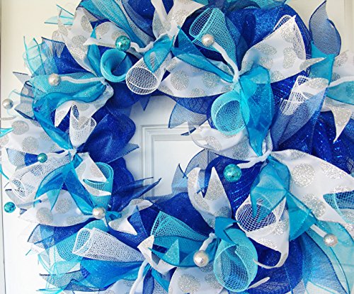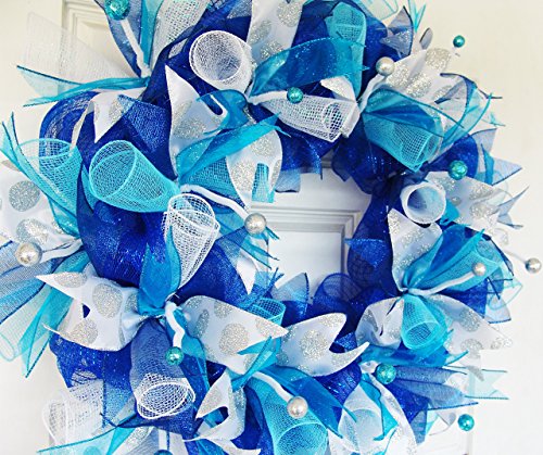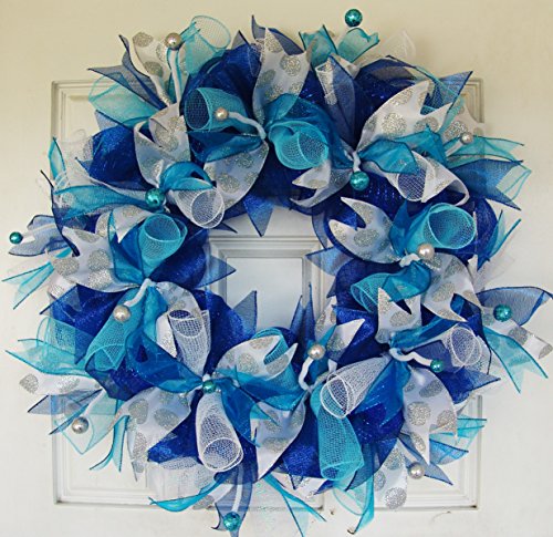 Dark Royal Blue Teal Silver Hanukkah or Christmas Deco Mesh Front Door Wreath, Porch Patio Garden, Wall Mantel Fireplace, Unique Gift Idea