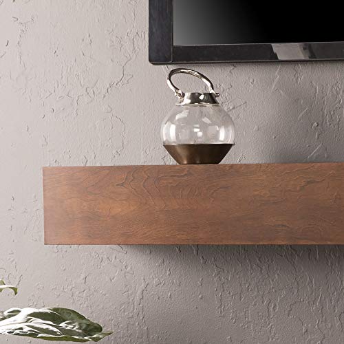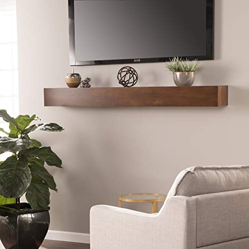 Add sleek simplicity to your home with this floating wood mantel. Rich whiskey maple easily blends into existing décor as a mantel or a decorative shelf for the living room. Bracketless design creates a modern fireplace mantel shelf or streamlined look in your home office. Your bare walls will thank you.60-inch mantel shelf or decorative shelf