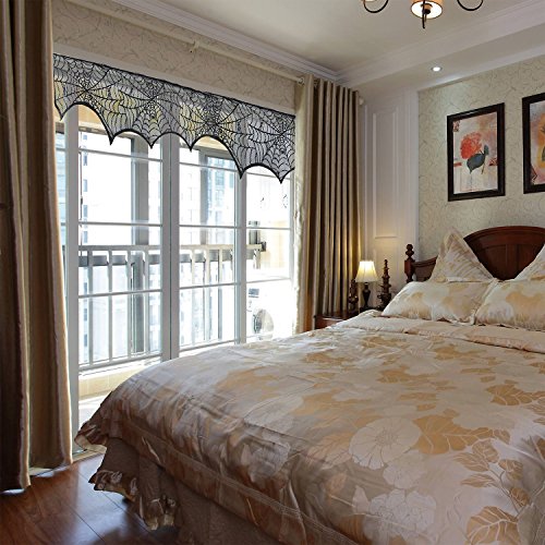 Dimension: Width:9.05"-18",Lenth:96"✅ HALLOWEEN DECORATION:Creating the perfect ambiance for your Halloween, Thanksgiving or other party with elegant spooky black lace decor accessories Lace knitted craft with spider web design and used in the black lace fireplace mantle scarf. fun spooky Halloween and Thanksgiving decoration and party accessory for year round use