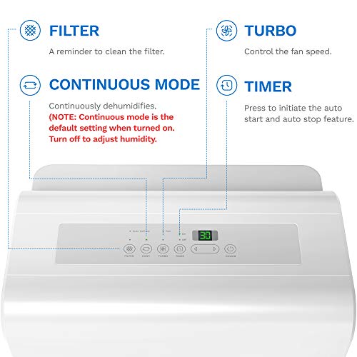 - Features: Touch control panel; auto restart, shut off and defrost; turbo mode with high fan speed; continuous dehumidifying with 24-hour timer; customizable humidity level from 35% to 85%