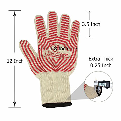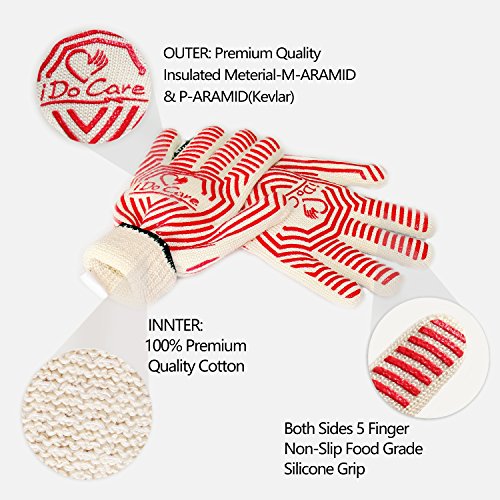 Click the ADD TO CART button and start keeping your hands safe with the best glove in the industry! Remember order two pair, One for meal prep, second for your other blade friendly jobs.NO MORE BURN YOUR HANDS - iDoCare oven gloves are made of excellent heat insulation material, the outer is made of extremely heat resistant Meta-Aramid Fibers, same material used in Fire Fighters' Vests, can witstand 662°F temperature up to extreme 932°F(instantaneous temperature). The inner is made of 100% premium quality cotton, comfort feeling without losing its flexibility, provide best protection for your hand.
