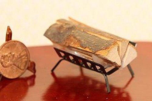 Filled Fireplace Log Holder in Black Metal Designed for the 1:12 scale miniature setting. Measures: 1 1/4 in wide x 1 in deep x 3/4 in tall. Made of painted metalDollhouse Miniature
