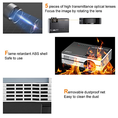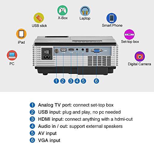 Easy Setup: No warm-up time, directly project onto a white wall or ceiling. Directly play Music, Pictures, Video files from a USB stick and external hard drive, no pc needed. Front/Rear/Ceiling Projection, Projection size: 23-120 inch, Throw distance: 2.62-11.54FT, support 16:9 widescreen display and 4:3, can be ceiling mounted, come with remote control.