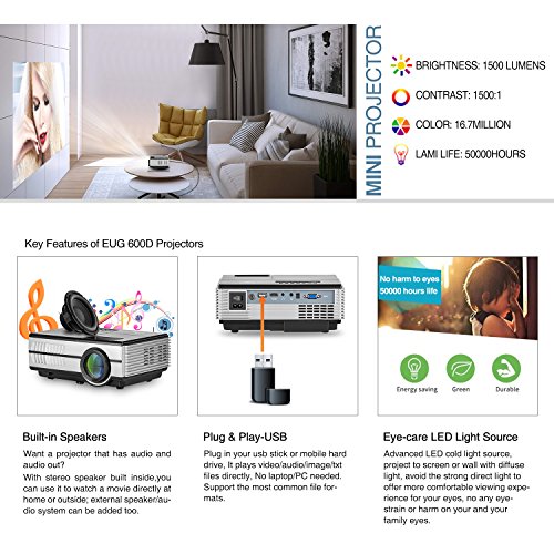 TFT LCD Display, LED 1500 lumens provides an image in vivid color and with great brightness in dark room; 960*640 native resolution, support 1080p, 1080i, 720p, 576p, 480p; diffuse reflection light does no harm on your eyes, protecting your eyes from small tv and smartphone, no rainbow effect. 50,000 Hours led lamp, maintenance free, no extra replacement costs.