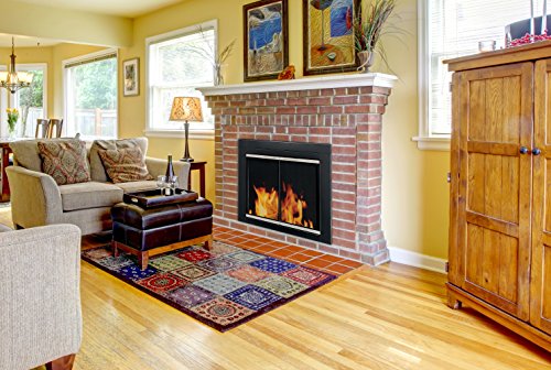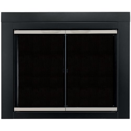 Suitable for a traditional masonry fireplace, the decorative and cabinet-styled Pleasant Hearth Alsip Collection Glass Fireplace Doors have a 1-piece welded frame with Sunshine Nickel trim and a high-heat, powder-coated black finish. Designed as a surface mount, these doors sit outside the fireplace opening against a flat surface and help reduce heat or cool air loss up the chimney by as much as 90% for year-round energy savings. The clear tempered glass doors open wide so you can enjoy a full fireplace view and feature easy-catch magnets, easy-grip handles, thick heat-resistant insulation and hidden damper control knobs for airflow control. The rigid mesh panels located behind the doors have safety handles and easy-catch magnets and should always be closed and glass doors opened when you have a fire going. Simple to install in 3 easy steps, these fireplace doors complement any decor style and are fully assembled.Fits openings 30 in. to 37 in. wide and 25.5 in. to 32.5 in. tall
