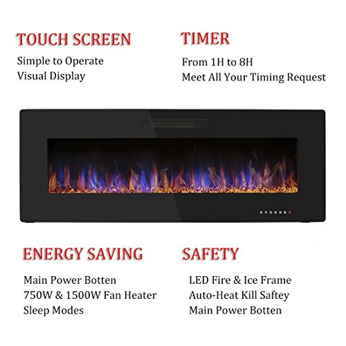 MULTI OPERATING MODES: Touch Screen On Front Panel;·12 flame & LED flame bed color modes;5 flame speed modes;5 flame brightness levels;Specially automatical flame design(the flame color and brightness changed automatically);1 hour to 8 hours timer control;8m remote control operating distance;Sleep modes with all lights down while heating.