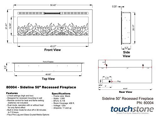Keep yourself warm during cold weather and add a hint of sophistication to your home with the Touchstone Sideline 50 Recessed Electric Heater Fireplace. This unit features two heat settings and five flame settings. The temperature options are high and low, and they can be adjusted to your preference. The fireplace can be switched to high to keep you warm during the winter, or it can be set on low to provide ample heat without being too hot. The electronic unit also emits authentic-looking flames with different fire levels, ranging from a soft ember glow to a strong blaze. The fiery light adds a crisp, relaxing vibe during dark winter days, keeping you warm and cozy at home. Both the heat and flame settings can be operated through a remote control. (Batteries are not included in this package.) The Sideline fireplace has several configurations to match your desired temperature and atmosphere. A built-in timer allows you to shut the unit off after a set period of time, from 30 minutes to 7.5 hours. Touchstone Fireplace is designed for recessed wall placement. The 50-inch electric fireplace boasts an elegant black frame that evokes a contemporary look. It can be installed in living rooms, bedrooms, offices, and more. The unit can heat a room as large as 400 square feet through its top front vents, and operates on 1,500 watts with a voltage of 120. The set includes faux logs and crystals to create a genuine fireplace feel. Easy-to-follow instructions are included to help homeowners install the unit on their own. It is recommended that this fireplace be positioned at least 12 inches below the ceiling. Avoid mounting it directly under a flat-screen television, as that may limit the heater's use.DESIGNED FOR IN-WALL INSTALLATION: This electric fireplace is specially created for recessed mounting in walls. Its black frame gives a room a sleek, modern look. This versatile fireplace also adds a cozy touch to a living room, bedroom, or office. The 50-inch fireplace comes with easy-to-follow instructions to help homeowners install the unit on their own.