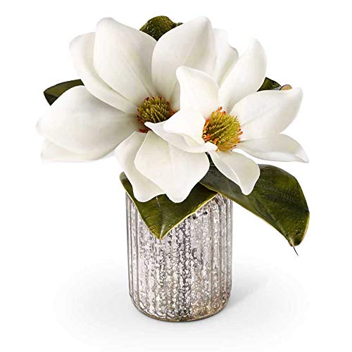 Sure to be one of your favorite beautiful little treasures for your home. Enjoy the white magnolia blooms and deep green leaves rising for the silvery mercury glass vase. Simply place on a table, mantel or shelf and enjoy. As a wedding decoration place in the center of a table, Group together with on raised in the center, simply take it up a notch by using books as risers. Perfect for any season the list of ways to use this wonderful arrangement is endless. A decorative floral arrangement that will look beautiful in your home now, and it will still be gorgeous around the holidays.A beautiful, and elegant the Magnolias decor silk floral arrangement is perfect for any season. Will never go out of style.