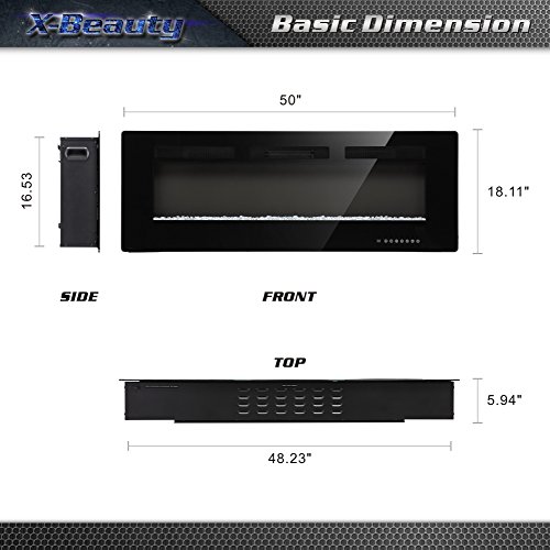 Designed for recessed:Can be fully or partially recessed in wall,can also wall mounted and free standing.The dimension is 50"x5.94"x18.11"(LxWxH).The top independent physical switch design has passed ETL security certification.Back frame design makes the linear glass display larger for optimal viewing, which also reduces the possibility of damage to the glass panel during transportation.Realistic Flame Effects:Full spectrum LED colors for a unique ember bed display - 12 flame colors includes the upgraded 3 classic flame colors (red orange and blue),5 flame speeds & 5 flame brightness's,12 ember bed color lighting options.The large display allows the flame to "burn" high enough, flames emerge slowly from the "source" and then get pulled to the top of the fireplace where they flash in the heat of the top of the fireplace.