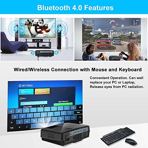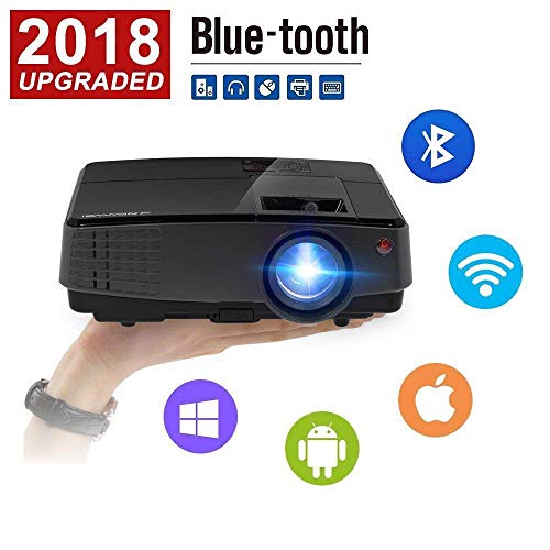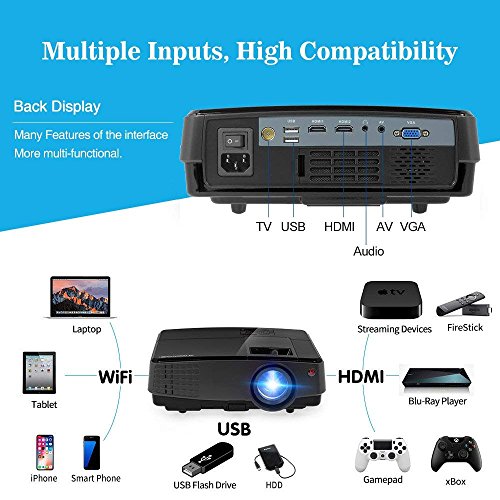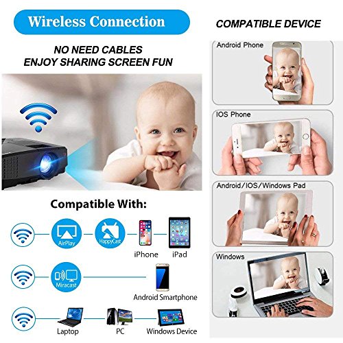 【2018 New Version Wifi Bluetooth Projector】-CAIWEI Projector can project directly from your iPhone/Android smartphones through wifi, No Need to buy other Wireless dongles, or download any apps; Plus with bluetooth 4.0 feature, Wirelessly stream sound directly from the LED projector to a Bluetooth compatible sound system like home audio speakers, headphones or portable speakers for better sound effect. If you do not wanna buy a bluetooth speaker, that' s ok, here is built in 5W HIFI speaker!