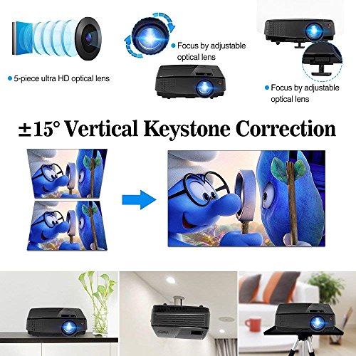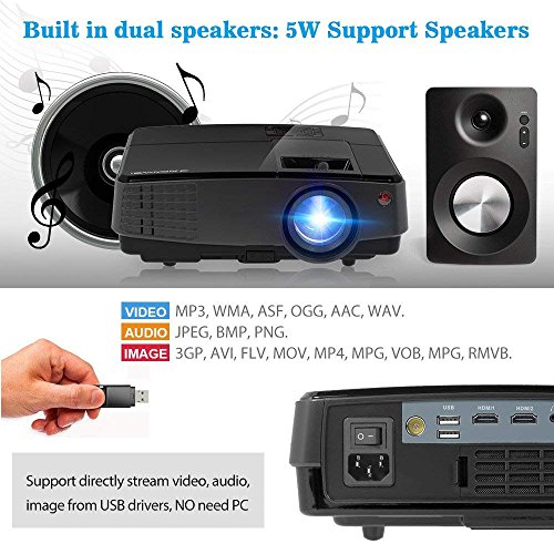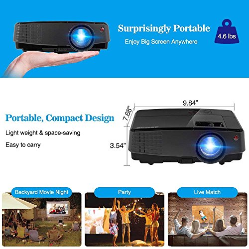 【Excellent Picture Quality】- Brightness: 2600lumens, Native resolution 1024x 600, supports 1080p/ 720p and vivid color, 2200:1 dynamic contrast ratio for rich detail in different scenes. Ideal for providing vivid and clear images in the dark with this mini video projector, brighter than ordinary led projectors. It is built-in HD decoder chip supports 1080P video input, so you can enjoy 1080P movies with your family.