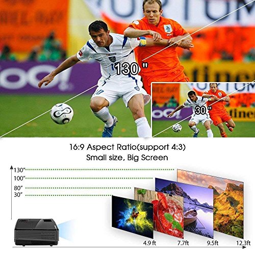 【True Big Screen Experience】 - An excellent combination of ultra-big screen: 29-130 inch, Throw Distance: 2.42-10.76 ft. Large sceen home theater viewing experiences are here for you. Easy installation,Professional installation not required. Turn on/ off in second. Projection Method: Front, Rear, Suspended Ceiling. Compact Size: 8.3x5.7x3.1 inch, N.W : 2.43 lb, real mini size, Easy to hold on hand, and take it anywhere, fits your bedroom, living room, backyard, outdoor camp etc.