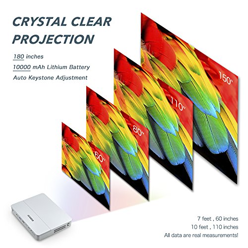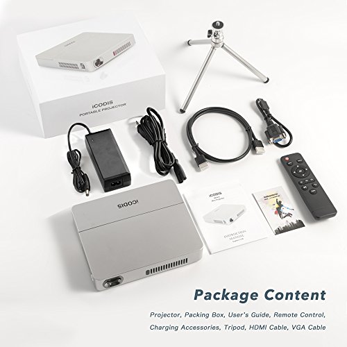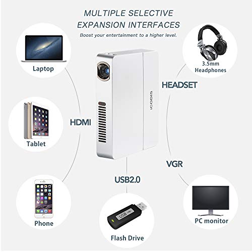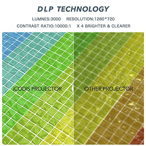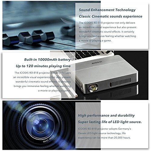 iCODIS RD-813 Mini Projector, 3000 Lumens, Native HD Resolution, 10000:1 Contrast Ratio, Build in 10000mAh Battery, Portable Pico Projectors