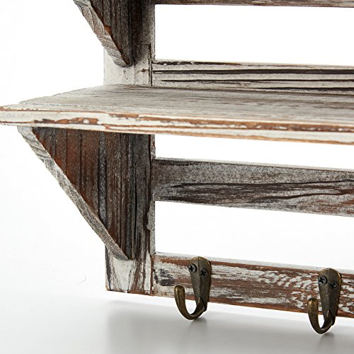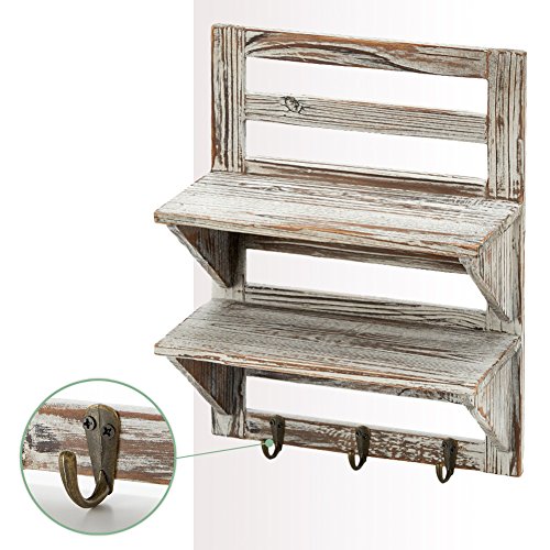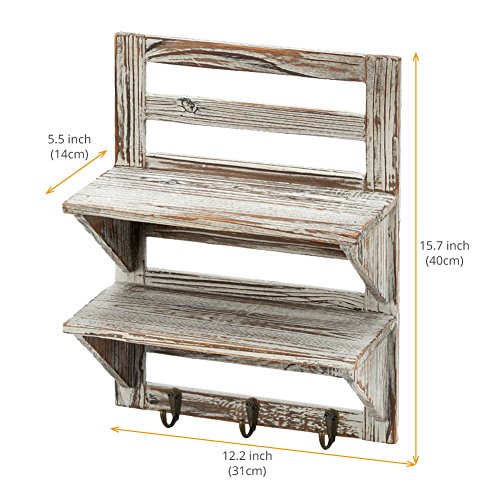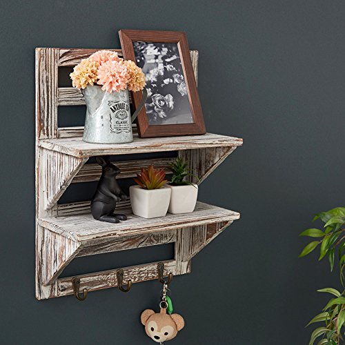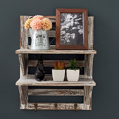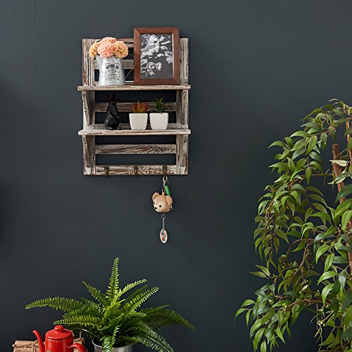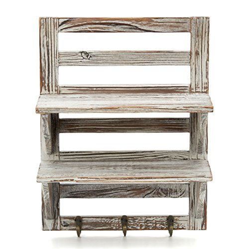 EZOWare Rustic Torched Wood Hanging Shelves & Organizers offer a simple and charming way to display, showcase, and organize home decor accents or personal items. The organizer has 2x 5.5" deep shelves to store knick-knacks or smaller memorabilia and 3 hangers to hang keys and key chains, necklaces, or smaller accessories. The rustic torched and distressed wood has an antique neutral color finish to complement or contrast displayed items. A versatile furniture that can be used in almost any room or living space, keep items organized and in sight.