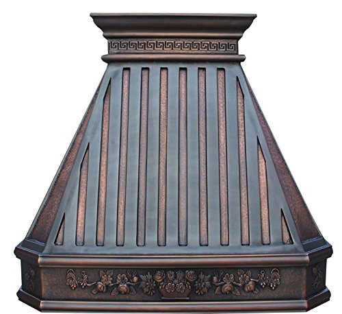 Stunning copper range hood cover is handcrafted from 16 Gauge solid copper (99.9% pure virgin copper, not recycled copperr) by skilled copper artisan with elegant design, installs easily and free maintance, hand hammered or smooth copper surface texture, decorative crown and patterns with variance of patina gives unique and antique element to your kitchen