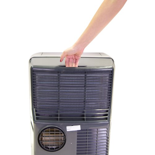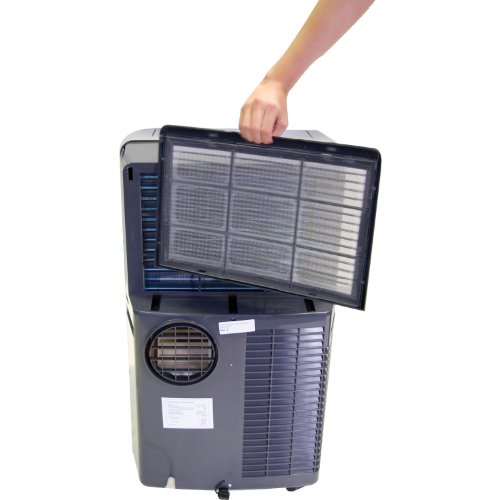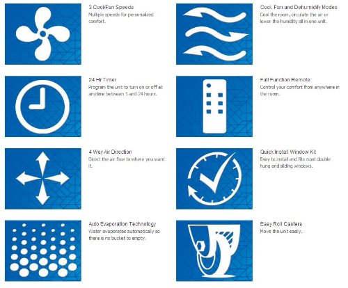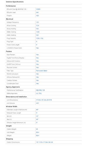 This 12,000-BTU portable air conditioner is ideal for spot cooling mid-sized rooms up to 450 square feet. With three cool settings, three fan settings, a 24-hour on/off timer and dehumidify mode, this single-hose model is equipped to meet your interior climate needs. A Quick-Install Window Kit is included for exhausting the unit through any horizontal or vertical opening window and fully directional casters provide mobility. Maintenance is minimal with a slide-out washable mesh filter and Auto Evaporation Technology makes manual draining unnecessary.Cools rooms 350-525 sq. ft.