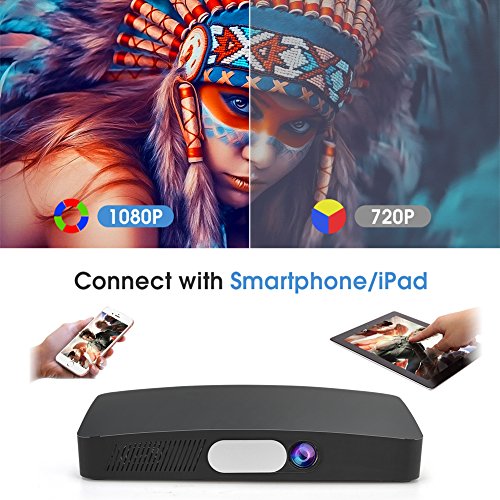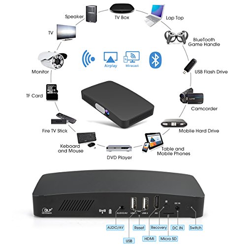 【Multiple Connectivity Technology】Just connect to WiFi network and then select your preferred option for playback. The D2 is also capable of connection to a standard tripod (D2 comes with a mini tripod) for easy mounting and stable viewing. This item have Audio out port, USB(2), HD port, TF card port, and Power input port. You can easy to connect to other devices and watch movies or you just can choose to stream over Miracast or Airplay without cable.